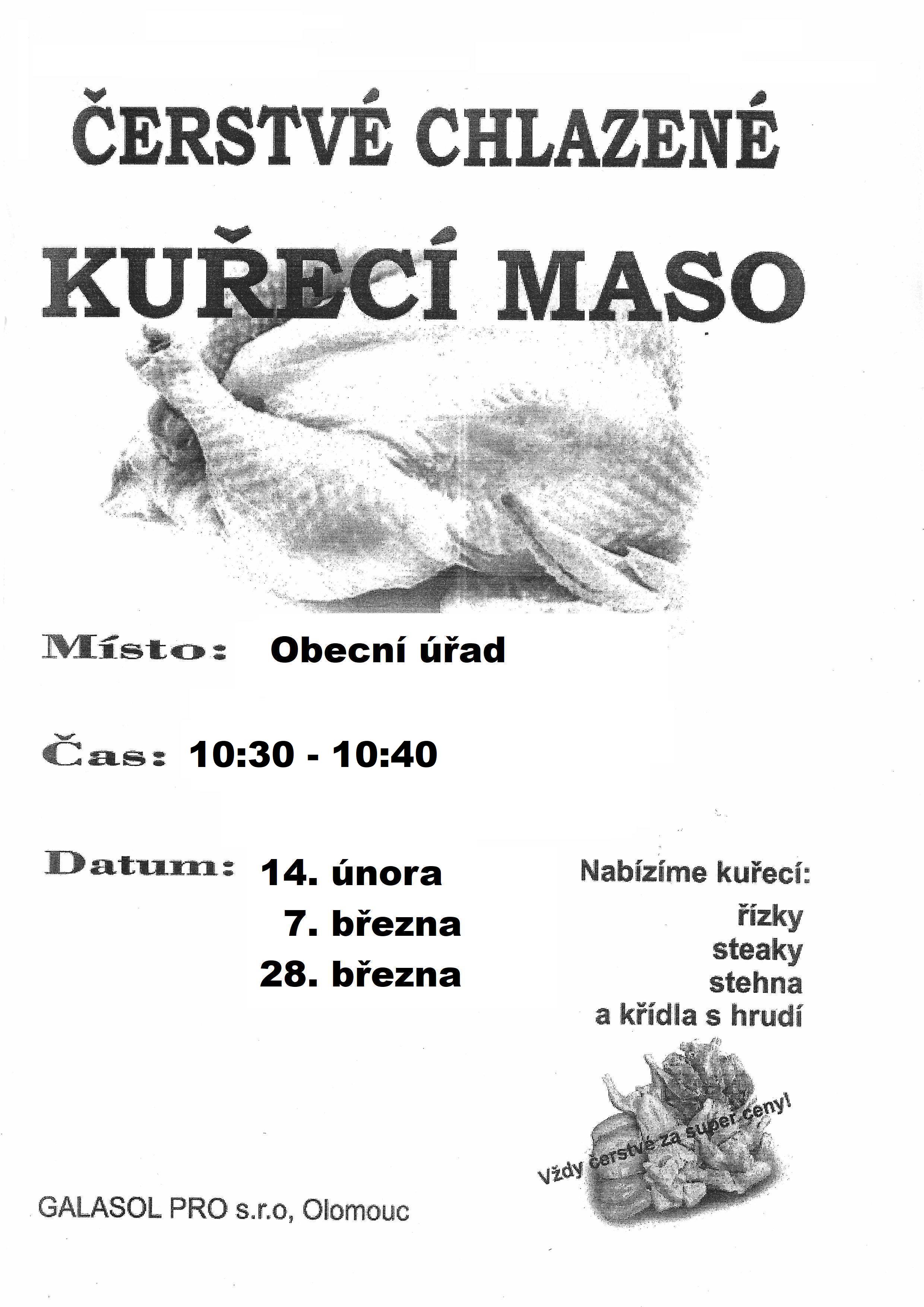 Dále Vás chci informovat, že do naší obce bude jezdit pojízdná prodejna Maso uzeniny Bobrová. Čas je upřesněn v přiložené tabulce.
